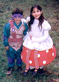 ילדה יושבת על פטריה וצב נינג'ה (דונטלו).