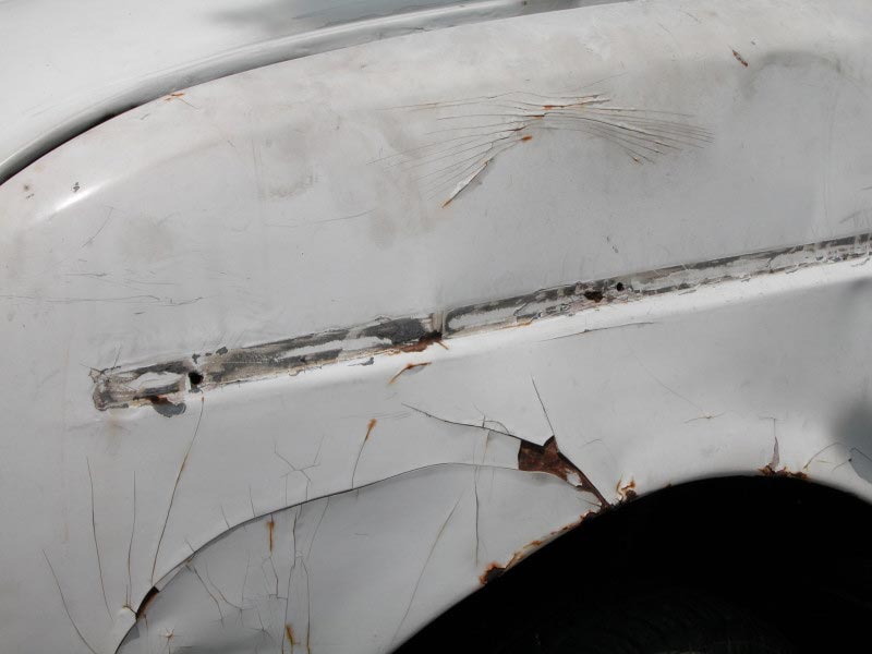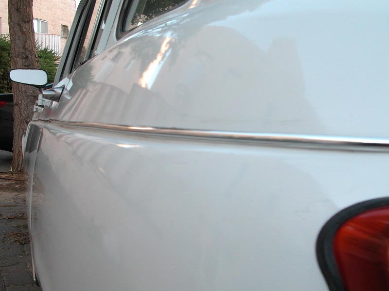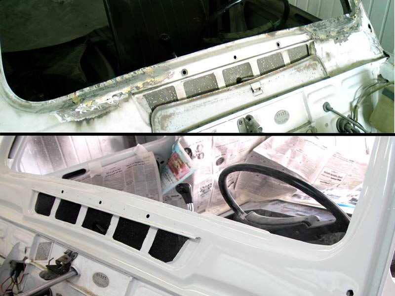 כפי שתואר למעלה, הרכב עמד תקופה ארוכה בשדה ללא טיפול. באזורים רבים מבצבצת חלודה, חורים ורקבונות. הרכב נראה שתוקן בעבר ויש מכות בפח. הטיפול בפחחות נמסר לבעל מקצוע שישקם את כל הרכב.הערכת מצב: עקב ריבוי התיקונים שנעשו ברכב בעבר היה צורך להסיר את כל החומר פחחים הישן הסדוק והמתקלף עד לפח. כך שניתן להעריך את מצב הפח שמתחת. בכל חלקי הפח יש מכות קלות הדורשות ישור. כנפיים סדוקות. חורים ורקבונות קשים: כנף אחורית בחיבור לגוף, ליד צירי דלתות הקידמיות, בתחתית החלון הקידמי והצידי מאחור. פעולות שבוצעו: ראשית פורקו כל החלקים המורכבים על הגוף, חלונות, גומיות, קישוטים, פנסים, ניקלים, סמלים וכו' (תמונה 1). בכל המקומות הרגישים הוסר הצבע והחומר מתיקונים קודמים עד לפח (תמונה 2). הבעיות טופלו בהתאם לרמת הנזק: מכות בפח - יושרו בגג, מכסה מנוע וכנפיים. סדקים - טופלו על ידי הלחמה ותוספת פח לחיזוק, בכנפיים קדמיות ואחוריות. חורים ורקבונות בפח - נגזר הפח החלוד עד למקום בו יש פח שלם. הותאמו חלקי פח מתאימים לחורים שנוצרו, שהולחמו למקומם כנף אחורית פנימית (תמונה 3), קורות לייד צירי דלתות קידמיות (תמונה 4), מסגרת תחתונה של חלון קידמי (תמונה 6) וחלון צידי אחורי (תמונה 5). הלחמות הושחזו ונמרח חומר לקבלת פני שטח חלקים. לאחר התקשות החומר, בוצעה החלקה ובתהליך החוזר על עצמו בוצעו תיקונים לפח ולחומר פחחים בכל הגוף עד לקבלת צורה ופני שטח מתאימים. לאחר קבלת תוצאה רצויה בוצע צביעה עם חומר פחחים עדין בהתזה. ושוב החלקה עדינה לקבלת פני שטח חלקים ביותר לפני הצבע. |