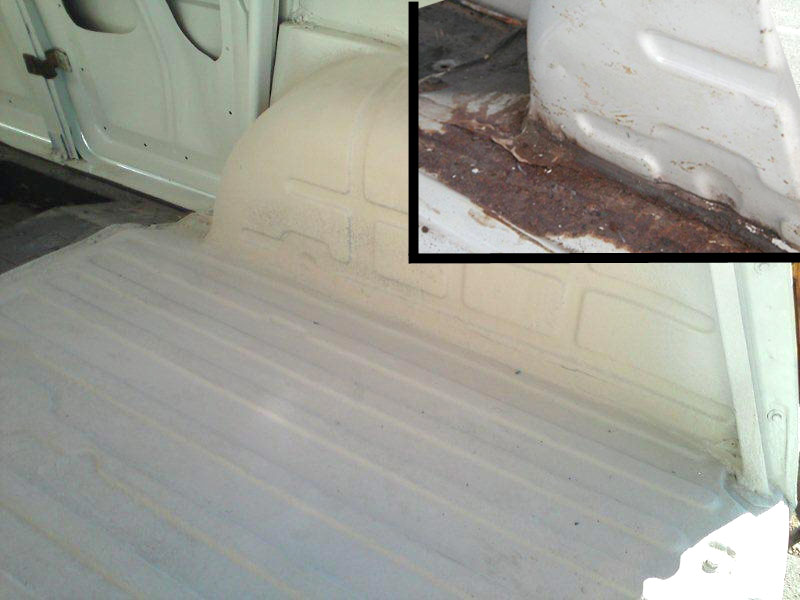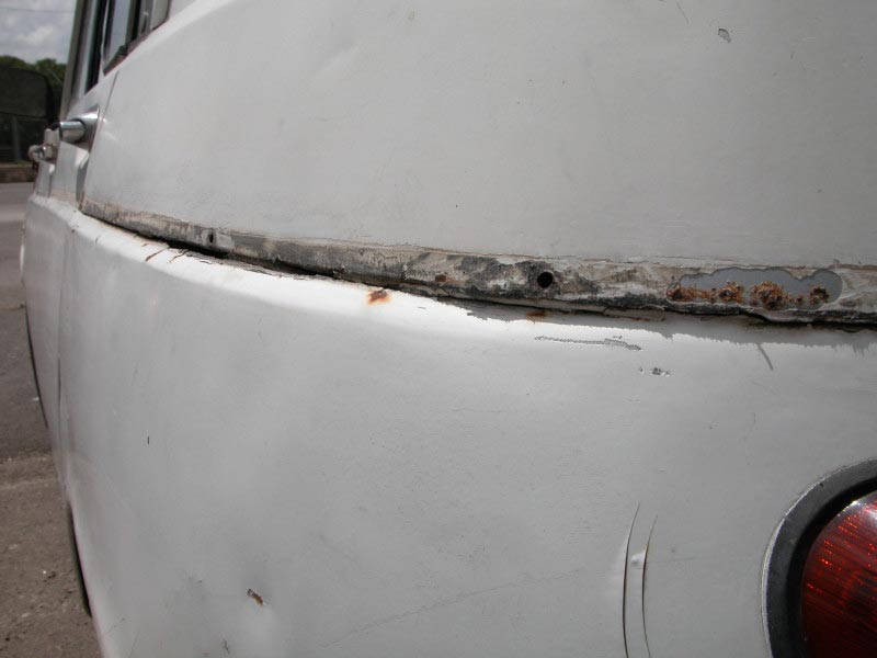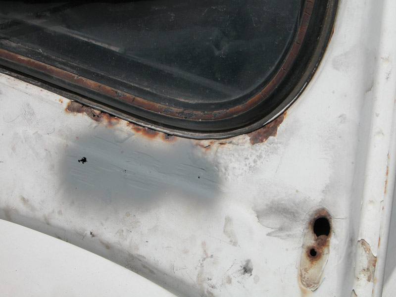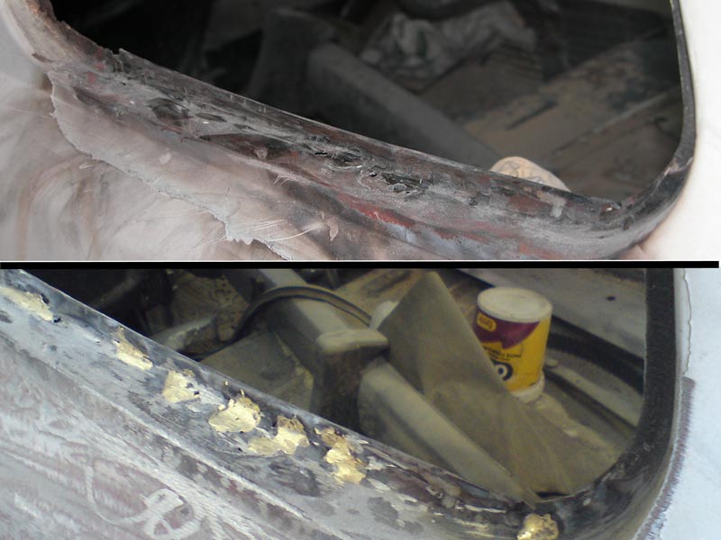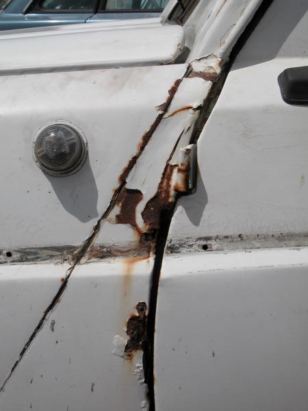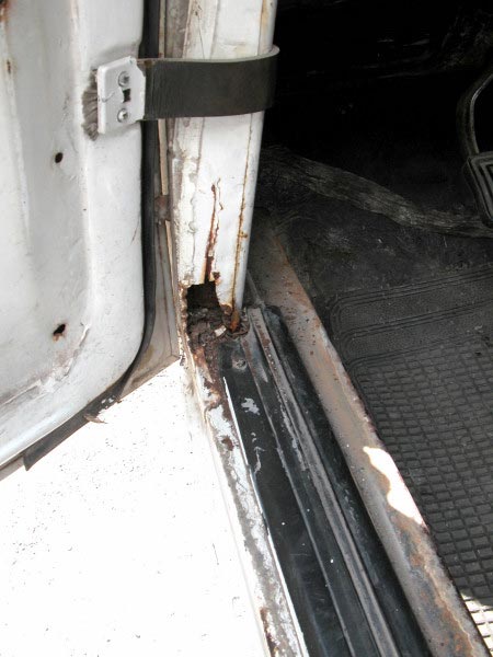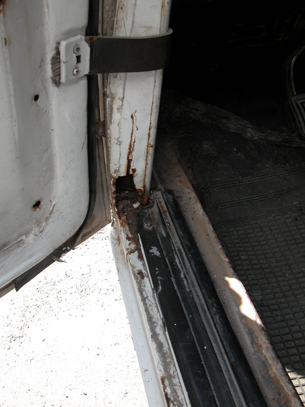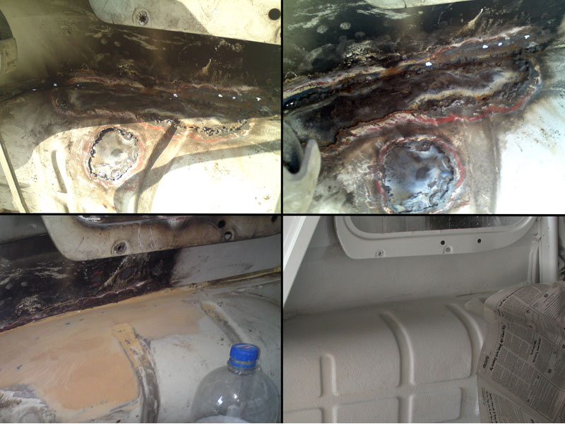 יש צורך בפחחות כללית לכל הרכב.תוכנית עבודה: לבצע את כל מה שאפשר לבד, ובמקומות שאי אפשר לבד להיעזר באנשי מקצוע. לשם כך השלב הראשון להעביר את הרכב טסט. שלב שני לפרק כל חלק לבדוק מצבו ובמידת הצורך לנקות/ לשפץ/ לצבוע/ להחליף ולהחזיר. תוך השבתת הרכב לפרקי זמן קצרים. שלב שלישי לגשת לאנשי מקצוע לביצוע עבודות כמו תיקוני פח וצבע. אתחיל בעבודות הקלות ואתקדם לפי הקושי. לעזרתי אשתמש בספר הרכב WORKSHOP MANUAL המקורי של רנו וספר הינס לרנו-4 מהם נלקחו גם השירטוטים. בתמונות משמאל: חורים ורקבונות בפח. |