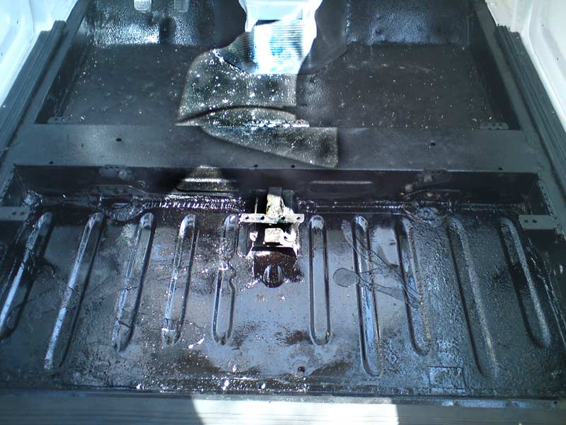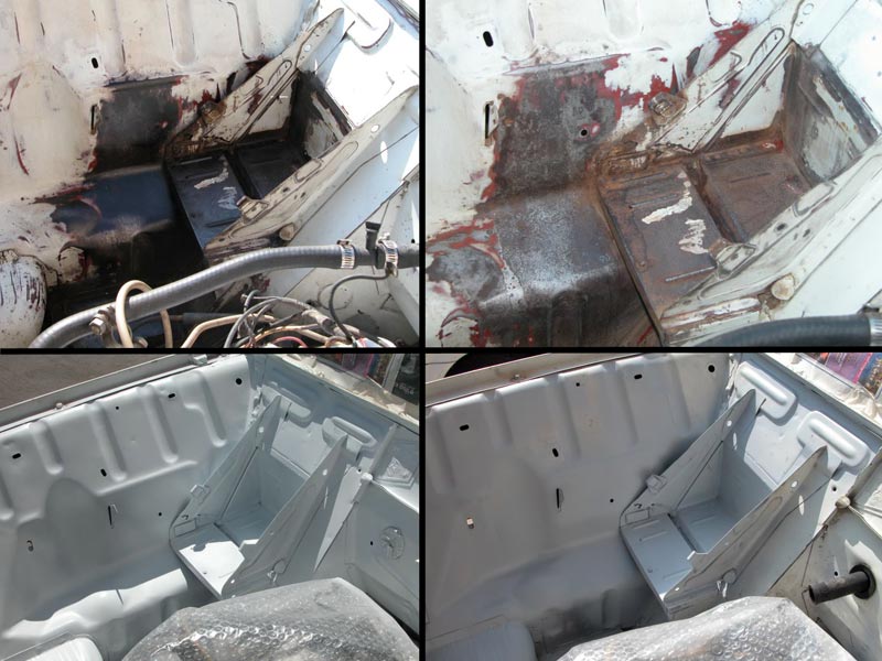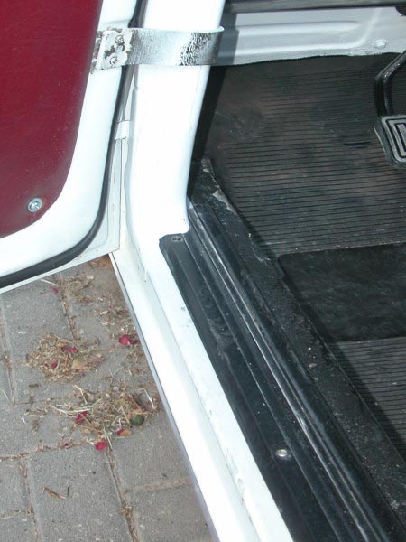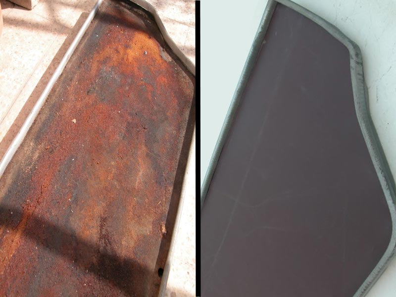 הערכת מצב: תא נוסעים קדמי - הרצפה רקובה לגמרי ולמעשה לא קיימת. שכבת האיטום העשויה נייר זפת לא קיימת. שטיח הגומי שלם ברובו. נדרשת החלפה של כל הפלטה. תא נוסעים אחורי - הרצפה במצב טוב יחסי, שלימה ללא חורים כלל. ישנה חלודה על המתכת. שיכבת האיטום מתפוררת ברובה ונראה שבוצע ניסיון תיקון ואיטום בעבר. שטיח הגומי קרוע. תא מטען - ישנם שני חורים (רקבונות) בשני צידי הרצפה ליד הכנפיים הפנימיות. שאר הרצפה במצב טוב כולל צבע. שטיח הגומי שלם ברובו. פעולות שבוצעו: תא נוסעים קדמי - כל חלקי הרצפה הרקובים הוסרו מהרכב. ובמקומם הותקנה רצפה מפלטת מתכת אחת שלימה, הרצפה חוברה למרכב סביב סביב. הרצפה החדשה נצבעה בחומר איטום (דמוי זפת קר) החומר מיושם בהתזה ויוצר מרקם מחוספס. (עד כאן בוצע ע"י פחח מקצועי) לאחר מכן נצבע בצבע שחור. על הרצפה מונחת יריעת איטום ביטומנית (זפת) חדשה , גזורה לפי מידה ואיטומה בקצוות. טיפול בשטיח הגומי - הטיפול בכל השטיחים מבוצע באותה שיטה. בכל הקום שיש קרע או חור יש להדביק טלאי גומי מצידו התחתון של השטיח. החומרים הדרושים: חתיכת גומי של פנימית ישנה, דבק מגע, מספריים ונייר זכוכית. אופן הטיפול: גוזרים טלאי מגומיית הפנימי בגודל שיכסה את כל הקרע/חור עם שוליים של 5 סנטימטר מכל צד. מניחים את השטיח עם הצד התחתון כלפי מעלה, משייפים את אזור הקרע ואת הטלאי עם נייר הזכוכית, לקבלת פני שטח נקיים ומחוספסים. מורחים דבק מגע על השטיח והטלאי . מחכים 10 דקות שייתיבש הדבק ואז מצמידים את הטלאי בלחיצה חזקה. קדיחת חורים והרכבת כפתורים לעיגון השטיח לריצפה. תא נוסעים אחורי - הוצאת כל שכבת האיטום המתפוררת שעל הרצפה, וניקוי יסודי . שיפשוף החלודה שעל הרצפה, צביעה בחומר ממיר חלודה. צביעה בזפת קר. על הרצפה מונחת יריעת איטום ביטומנית (זפת) חדשה , גזורה לפי מידה ואיטומה בקצוות. טיפול יסודי בשטיח הגומי כמו בשטיח הקידמי. תא מטען - טיפול בפחחות בחורים כולל ריתוך טלאים ,חומר פחחים, שיוף וצבע. צביעת כל הרצפה בתא המטען וכנפיים פנימיות בחומר איטום (דמוי זפת קר) החומר מיושם בהתזה ויוצר מרקם מחוספס. בוצע ע"י פחח מקצועי. טיפול יסודי בשטיח הגומי כמו בשטיח הקידמי. בתא המטען אין שכבת איטום (נייר זפת). |