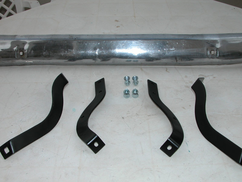פגושים פגועים ממכות ושריטות, מחזיקים עקומים וחלודים גומיות פגוש חסרות. פעולות שבוצעו: פירוק הפגושים (וחלקיהם), ישור הפגושים בעזרת פטיש וסדן, מאוד בעייתי כיוון שהפגושים עשויים ברזל עבה ומצופים ניקל כל פגיעה משאירה סימן. ישור המחזיקים בעייתי פחות. ניקוי הפגושים באמצעות חומר ניקוי והברקה למתכת. שפשוף המחזיקים והורדת שאריות חלודה וצבע עד למתכת. צביעה של המחזיקים ביסוד שחור מט, והרכבה עם ברגים חדשים מצופים. השלמת גומיות פגוש. |