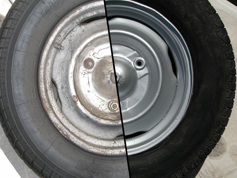 צבע הפח דהוי ומלוכלך יש צורך בניקוי וצביעה מחדש. הוחלט שלא להוציא מנוע אלא לפרק כמה שיותר מכלולים (בעיקר בגלל תנאי העבודה), כך להגיע ולטפל ברוב חלקי תא המנוע.פעולות שבוצעו: העבודה בוצעה במספר שלבים, פירוק רוב המכלולים המחוברים למנוע ולגוף הרכב בתוך תא המנוע. בדיקה ניקוי טיפול וצביעה של החלקים לפי הצורך. ניקוי המנוע חצונית ותא המנוע מליכלוך צבע ישן וחלודה. צביעת הפח במספר שכבות. שלב סופי הרכבה חזרה של כל המכלולים. פירוק מכלולים - הפירוק התבצע בזהירות שלא לפגוע בהברגות חלודות או חלקי פלסטיק יבשים שעלולים להשבר בנגיעה. כל חלק שפורק נארז עם כל חלקיו להמשך בדיקה. נתגלו גם מספר בעיות, ברגים לא מתאימים בסעפת פליטה, ההברגה בראש מנוע של בורג חיזוק תומך המותחן של הרצועה פגומה ונדרשת הברגה חדשה או הליקוייל. פלגים לא מתאימים, תפסני פלסטיק רבים שבורים. בדיקה וטיפול במכלולים - כל חלק שפורק נוקה בחומרים מתאימים. מתכות באמצות השריה בבנזין, חלקי פלסטיק במים וסבון. לאחר מכן נבדקו לשברים וסדקים, חלקי מתכת תקינים נוקו מחלודה באמצעות שיפשוף עד למתכת, במקומות קשים (מערכת פליטה) על-ידי ממיר חלודה, ולפעמים מספר פעמים. בצינור פליטה נתגלו חורים קטנים ובמגן הגיר סדקים גדולים. הנ"ל רותכו ונסתמו לפני המשך הטיפול. כל חלקי המתכת נצבעו בצבע מתאים, חלקים צמודים למנוע בצבעים עמידים לחום (עד C°600) וחלקים אחרים בצבע יסוד ולאחר מכן בצבע למתכת שחור מט . ניקוי מנוע והכנה לצבע - המנוע והפח נוקו באמצעות בנזין להורדת השמן והליכלוך הקשה. מקומות קשים לניקוי נוקו באמצעות ספרי ניקוי קרבורטורים (שמנקה יפה גם לכלוך אחר) הפח עבר שיפשוף בנייר מים גס ולאחר מכן עדין. במקומות מסויימים היה צורך להוריד את הצבע עד היסוד ואפילו עד הפח. הפתח בפח ליציאת צינור הפליטה עבר התעללות, הפח נחתך וקופף והיה צורך לישרו ולהוסיף טבעת חיזוק מאלומינים שחוברה באמצעות ניטים. לאחר הכנת כל הפח לצבע, כוסה המנוע והמכלולים שאינם נצבעים בכיסוי מגן, כל מעברי הגומי בדופן תא הנהג והכבלים כוסו בסרט דבק נייר. צבע - תמונה ראשונה (ימין למעלה) תא המצבר לפני צביעה. תמונה שניה (שמאל למעלה) נצבעו המקומות החשופים והחלודים באמצעות ספרי ממיר חלודה. זהו ספריי שקוף שעלפי היצרן במגע עם חלודה הופך לפריימר (יסוד) שחור. תמונה שלישית (ימין למטה) צבע יסוד אפור. תמונה רביעית (שמאל למטה) צביעה בצבע סופי , צבע רכב לבן בשלוש שכבות. הרכבה - שלב ההרכבה נעשה בזהירות שלא לפגוע בצבע ובחלקים המחודשים. בעיקרון נעשה בסדר הפוך לפרוק. הושלמו חוסרים כמו הדבקת רצועות גומי מתחת למצבר ובקבוק המים, השלמת קפיצים, גומיות מעבר, חוטי חשמל, פיוזים, ברגים תפסנים וכו'. |