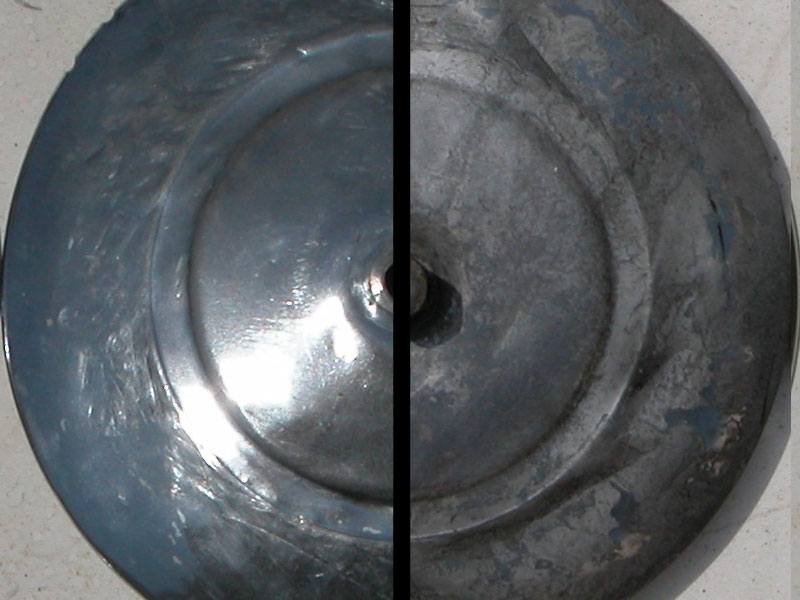 נקודות חלודה רבות, צבע מתקלף, שוליים עקומים. צלחות פגועות ושרוטות נקודות חלודה בציפוי ניקל וכיסוי חלקי של צבע.פעולות שבוצעו: הורדת הלכלוך עם מברשת פלדה, הורדת הצבע המתקלף והחלודה באמצעות נייר מים גס וניקוי עד לצבע היסוד עם נייר מים עדין, צביעה עם צבע מיוחד לג'נטים. אין אפשרות להחזיר את הצלחות למצב מקורי, בכל מקרה ישור הצלחות עם פטיש גומי וסדן קטן. ניקוי בחומרים חזקים להורדת הליכלוך והצבע. הברקה עם חומר ניקוי והברקה למתכת. הצלחות ישמשו באופן זמני עד להשגת צלחות במצב טוב יותר. |