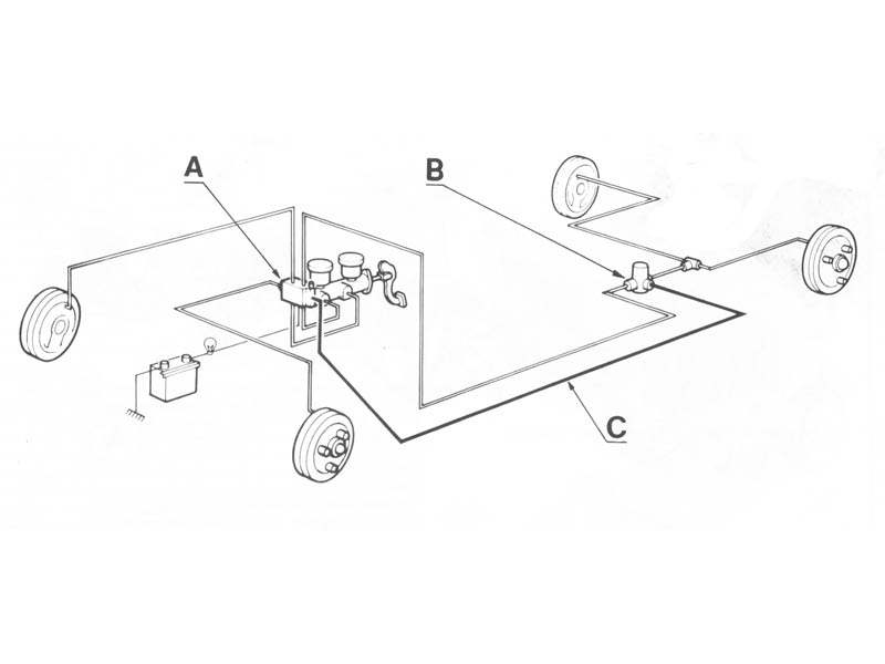 בקידמת המשאבה מורכב חיישן ירידת לחץ (A), המתריע לנהג על תקלה באחד המעגלים, ובמידה ויש נפילת לחץ במעגל הקידמי. נפתח גם שסתום המעביר לחץ למעגל האחורי דרך צינור (C) ועוקף את מקטין הלחץ האחורי (B).במהלך נסיעות קצרות ובדיקות של הרכב, הדוושה קשה מאוד והברקסים נתפסים מדי פעם בכל הגלגלים. הערכת מצב: תופים ומשאבות גלגל במצב טוב. משאבה ראשית וחיישן נפילת לחץ דורשים שיפוץ, בגלל תפיסת הברקס.חיישן נפילת לחץ - פסול. הבוכנה הפנימית חסרה, למעשה החלק אינו מתפקד ושני המעגלים קידמי ואחורי חוברו יחדיו. גם הקו הנוסף למעגל אחורי שאמור לעבוד רק בחרום עובד קבוע. פעולות שבוצעו: משאבה ראשית נמסרה לשיפוץ. חיישן נפילת לחץ (A) לא ניתן לשיפוץ ומקורי לא בנמצא. על כן הותקן חיישן דומה שלא קיים בו השסתום חרום. והקו הנוסף (C) בוטל זמנית על-ידי פקקים עד למציאת חיישן מקורי. |
