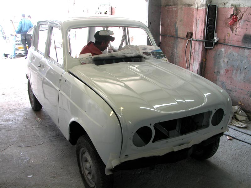 צביעת הרכב היא חלק אינטגרלי מביצוע הפחחות. כיוון שבוצעה עבודת פחחות נרחבת כך גם נדרש בצביעה, עבודה שנעשית על-ידי בעל מקצוע מומחה.הערכת מצב: ההכנה לצביעה בוצעה בשלב הפחחות, ועל כן נותר רק לבחור צבע מתאים. פעולות שבוצעו: בשלב הראשון נצבע כל הרכב בצבע יסוד לבן, בוצע בדיקה, תיקון והחלקה כהכנה לצבע סופי. נבחר צבע רנו המתאים לשנת הדגם 1974 ולצבע המקורי של הרכב 389. לאחר צביעה בתנור, בדיקה ותיקונים. הועבר הרכב להרכבה של כל הפריטים שהוסרו לפני שלב הפחחות. לאחר כשבוע שהצבע יבש בוצעו תיקונים אחרונים ווקס לגימור סופי. |