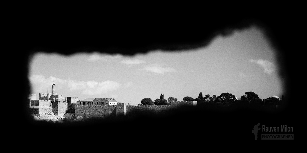 מגדל דוד והחומה נשקפים מתוך עמדה בשכונת ימין משה, ירושלים, 1950
